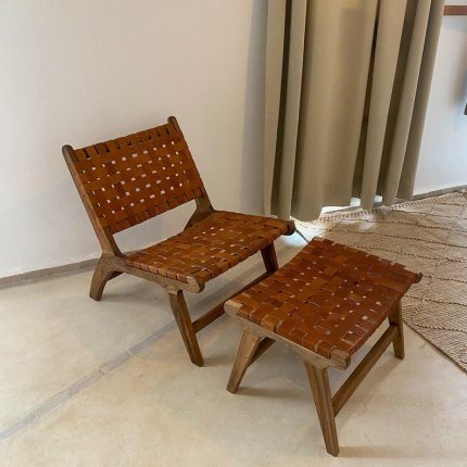 Moroccan Nutwood Armchair & Ottoman Set with Leather