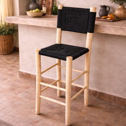 Moroccan Boho Bar Stool with Black Rope Weave – Handmade
