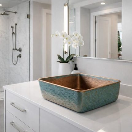 Turquoise Patina Square Copper Vessel Sink – Hammered Bathroom Basin