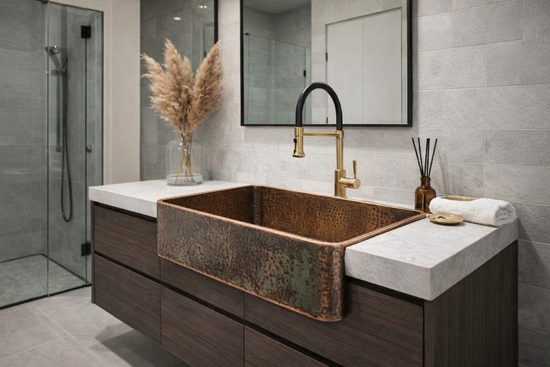 Antique Copper Apron Front Sink – Rustic Farmhouse Bathroom Basin