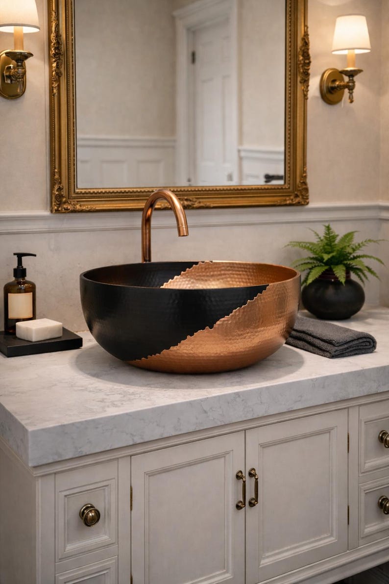 Make a striking statement with this black and copper hammered vessel sink. Featuring a bold two-tone design—matte black exterior paired with a warm hammered copper finish—this round countertop basin brings modern luxury and artisan texture to any bathroom.