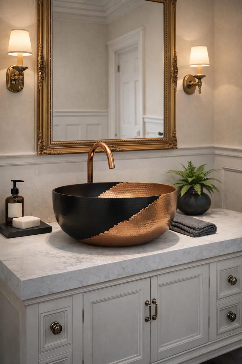 Black & Copper Hammered Vessel Sink – Modern Round Bowl Basin
