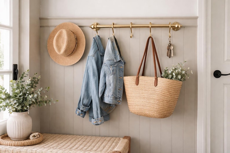 Organize your kitchen in style with this brass wall rail with hooks, perfect for hanging mugs, small pots, utensils, and kitchen accessories. The warm brass finish adds a classic touch while the wall-mounted design saves valuable counter space and keeps essentials within easy reach.