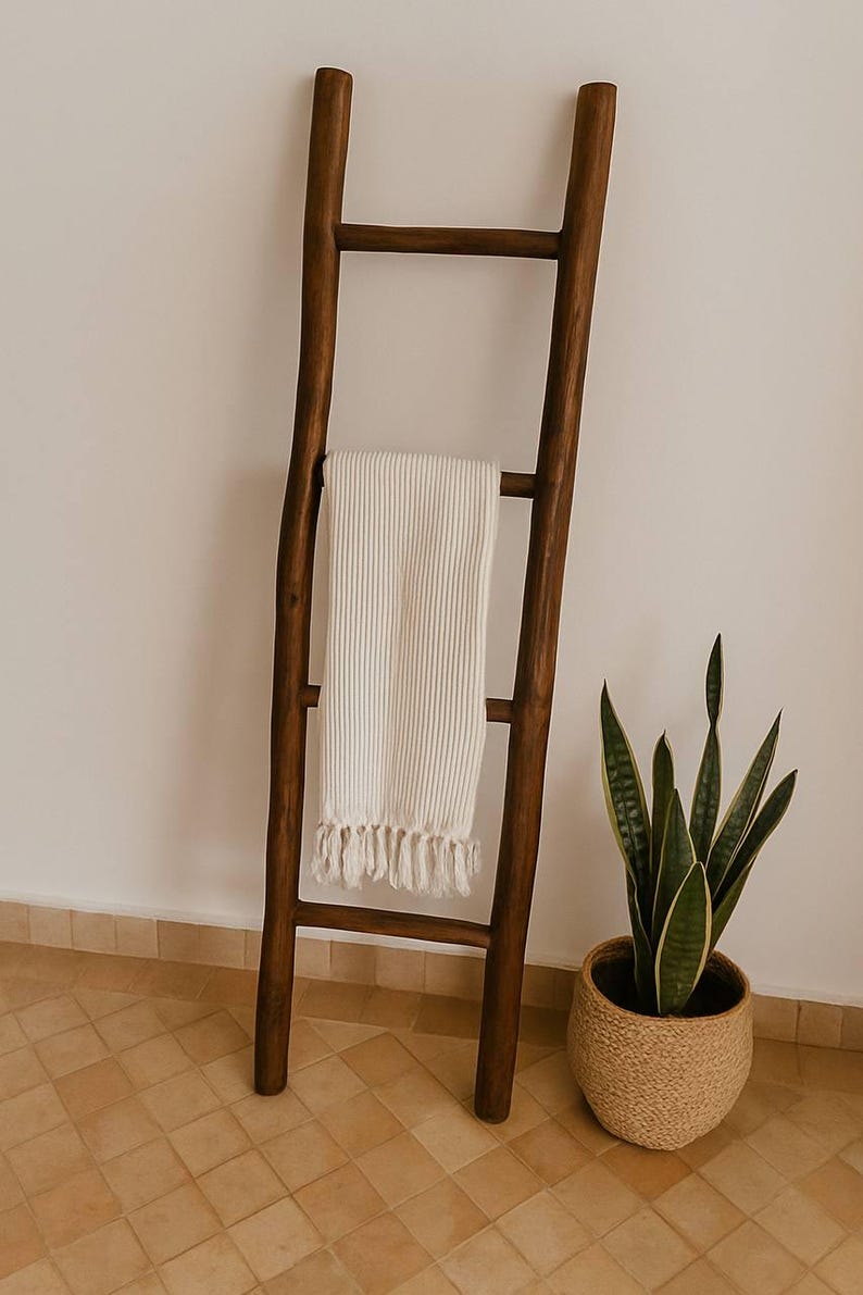 Add a touch of Moroccan craftsmanship to your home with this beautifully handcrafted wooden ladder. Designed with both function and style in mind, it serves as the perfect towel holder in the bathroom or a decorative accent in any room. Its rustic, natural look brings warmth and authenticity to your interior, enhancing boho, minimalist, or traditional décor.