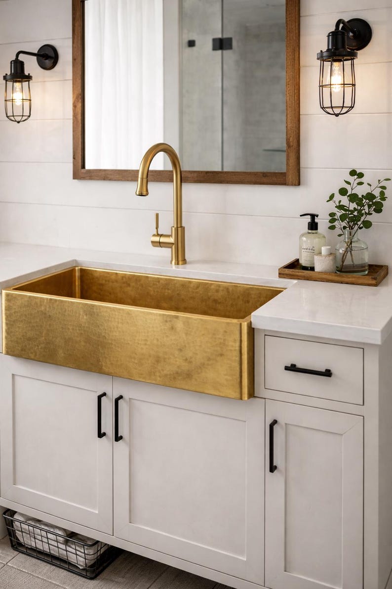 Make a bold statement with this hammered brass apron front sink, designed to bring luxury warmth and artisan texture to your space. Featuring a rich gold/brass finish and a handcrafted hammered front panel, this farmhouse-style basin becomes an instant focal point on any vanity or counter setup.