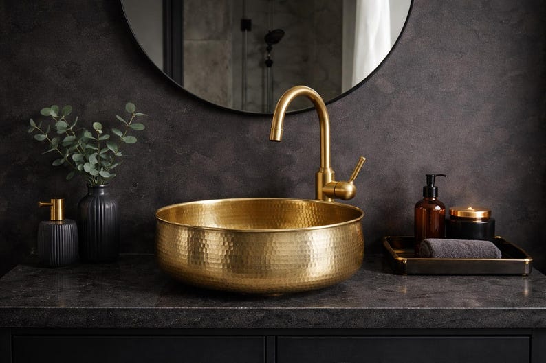 Hammered Brass Round Vessel Sink – Gold Bathroom Bowl Basin
