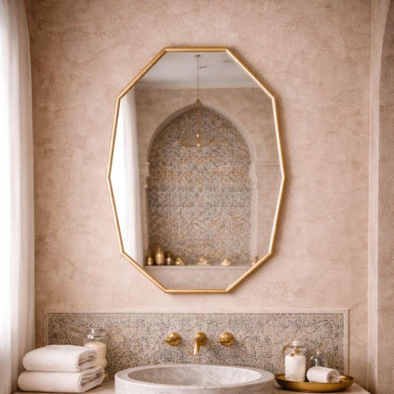 Made with a solid brass frame and high-quality mirror glass, this mirror offers durability and a clear, distortion-free reflection. The faceted shape adds visual interest while maintaining a sophisticated, minimalist presence, making it ideal for hammam-style bathrooms, riads, and luxury interiors.