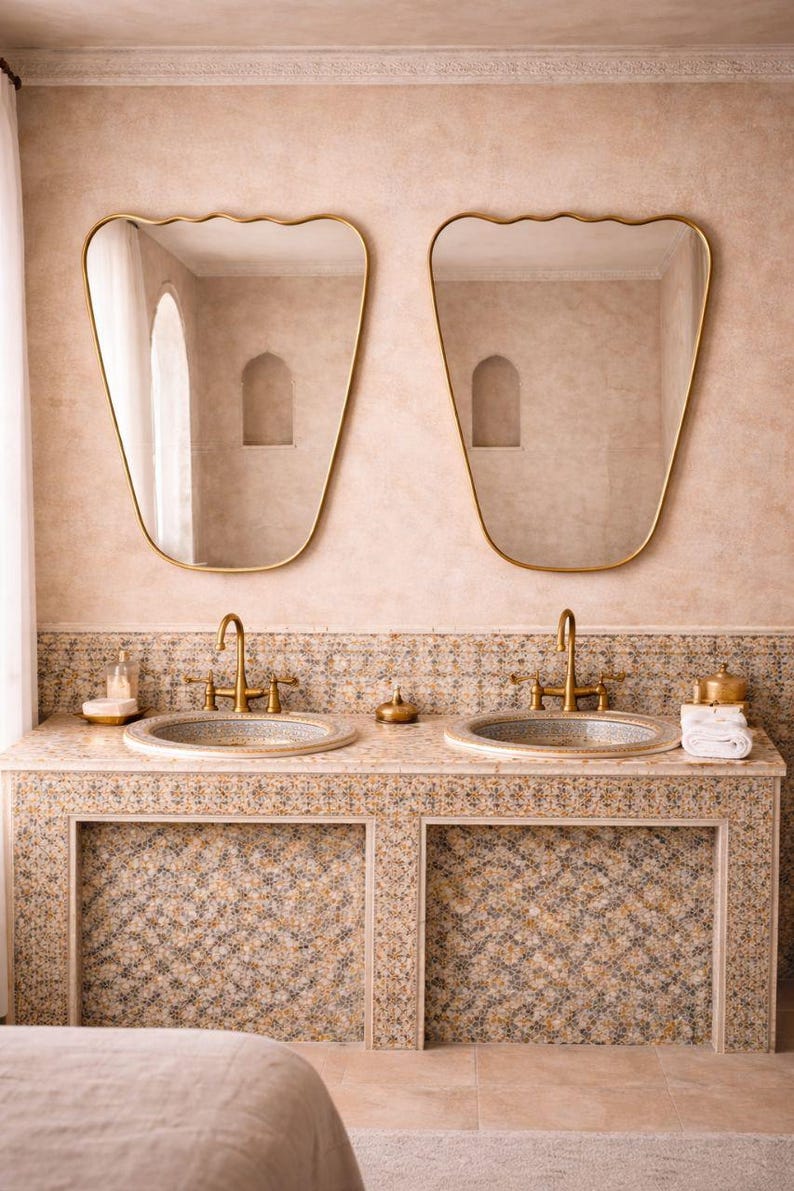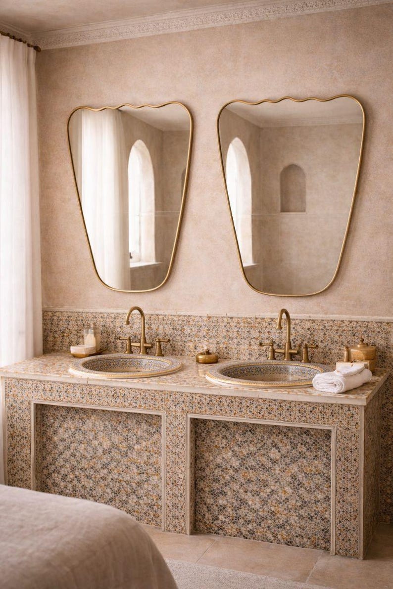 Made with high-quality mirror glass, it offers a clear, distortion-free reflection and beautifully enhances natural light. The fluid lines and handcrafted brass edge give this mirror a unique, artisanal feel, making it perfect for bathrooms, powder rooms, or interiors inspired by Moroccan, wabi-sabi, or minimalist design.