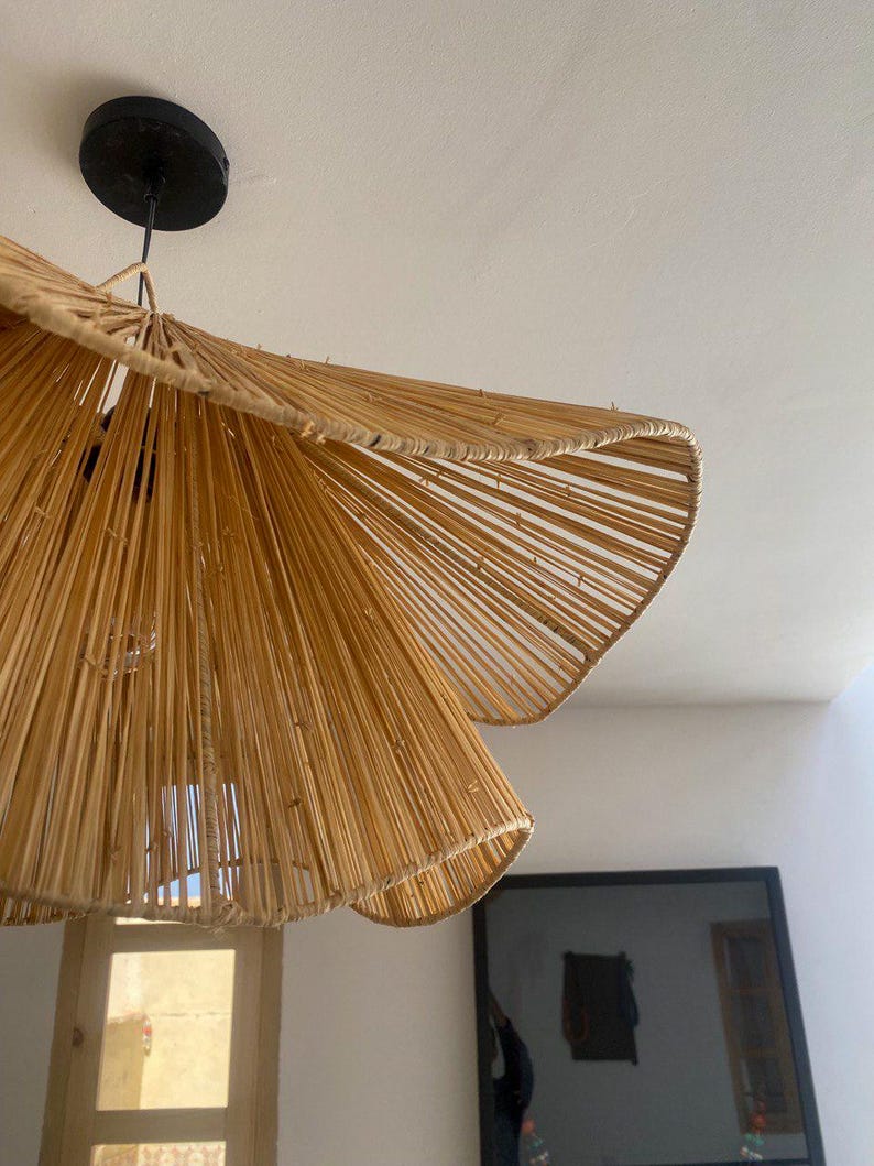This handmade raffia ceiling lamp features a flowing wavy design that adds a sculptural and organic touch to any interior. Handwoven by Moroccan artisans, the natural raffia softly diffuses light, creating a warm and inviting atmosphere.