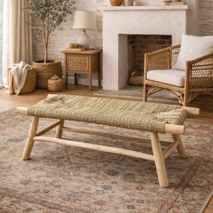 This handmade wooden bench, woven with palm leaf rope, brings a beautiful balance of rustic charm and natural elegance to any space. Carefully crafted by skilled artisans, it features a simple yet functional design with a solid wooden seat and woven rope details that highlight authentic craftsmanship.