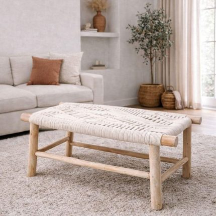 Handwoven Moroccan Bench with White Rope – Handmade Eucalyptus Wood