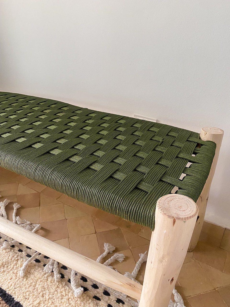 Handwoven Moroccan Bench with Green Rope – Handmade Eucalyptus Wood