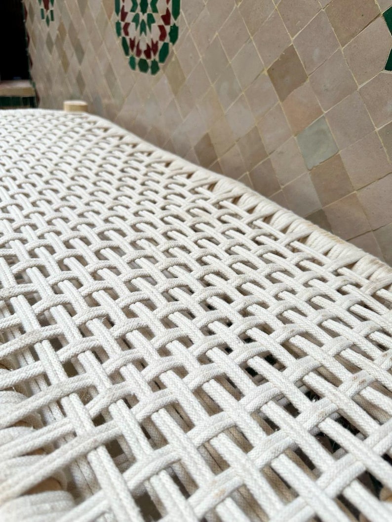 Handmade from eucalyptus wood and carefully woven white rope, each bench is unique. Natural variations in color and texture reflect genuine Moroccan artisan work. Ideal for indoor use and, when properly covered, also suitable for outdoor use.