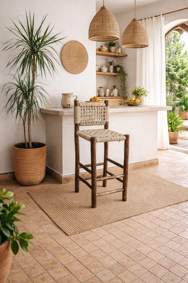 Moroccan Bar Stool with Palm Leaf Rope – Handmade Laurel Wood
