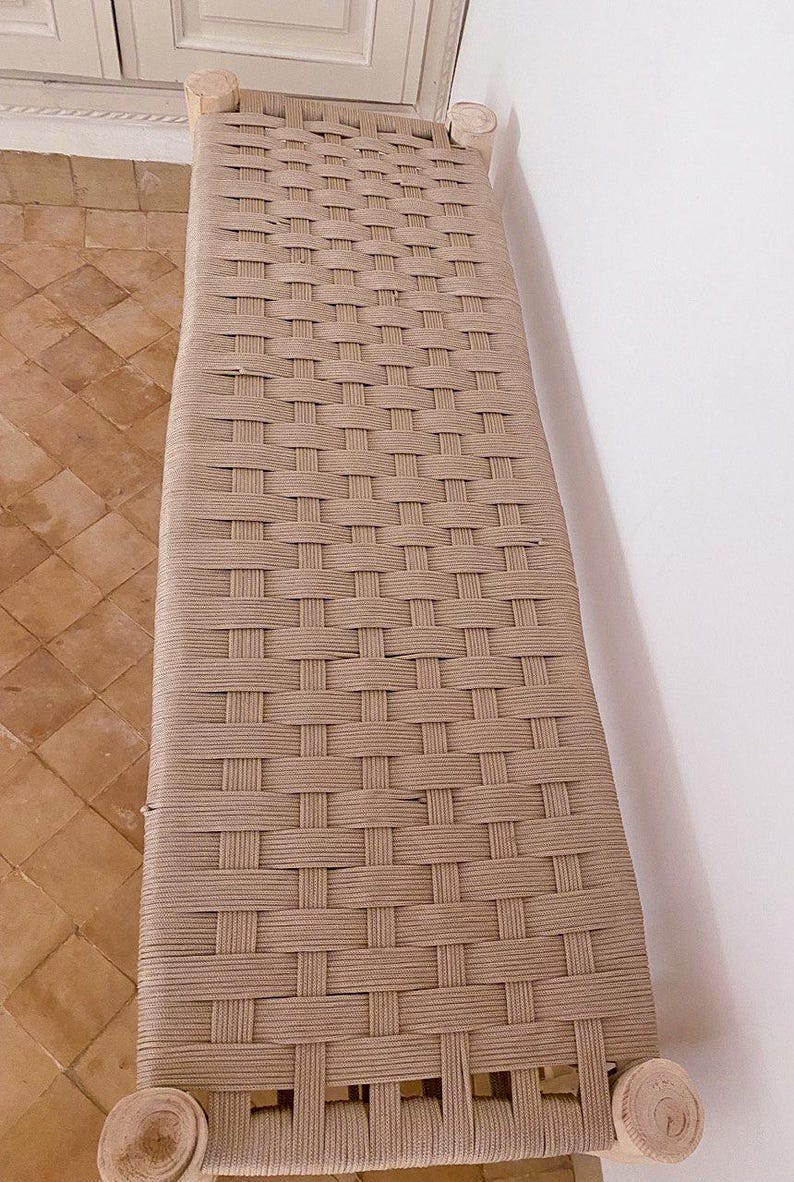 Handwoven Moroccan Bench with White Rope – Handmade Eucalyptus Wood