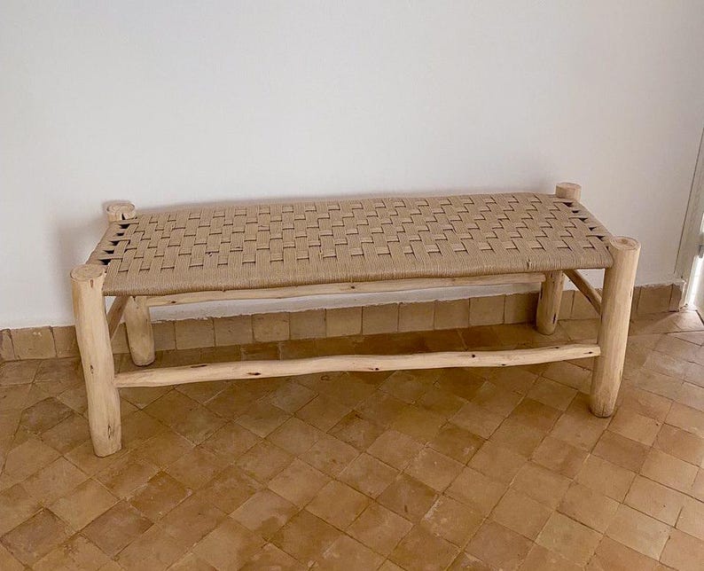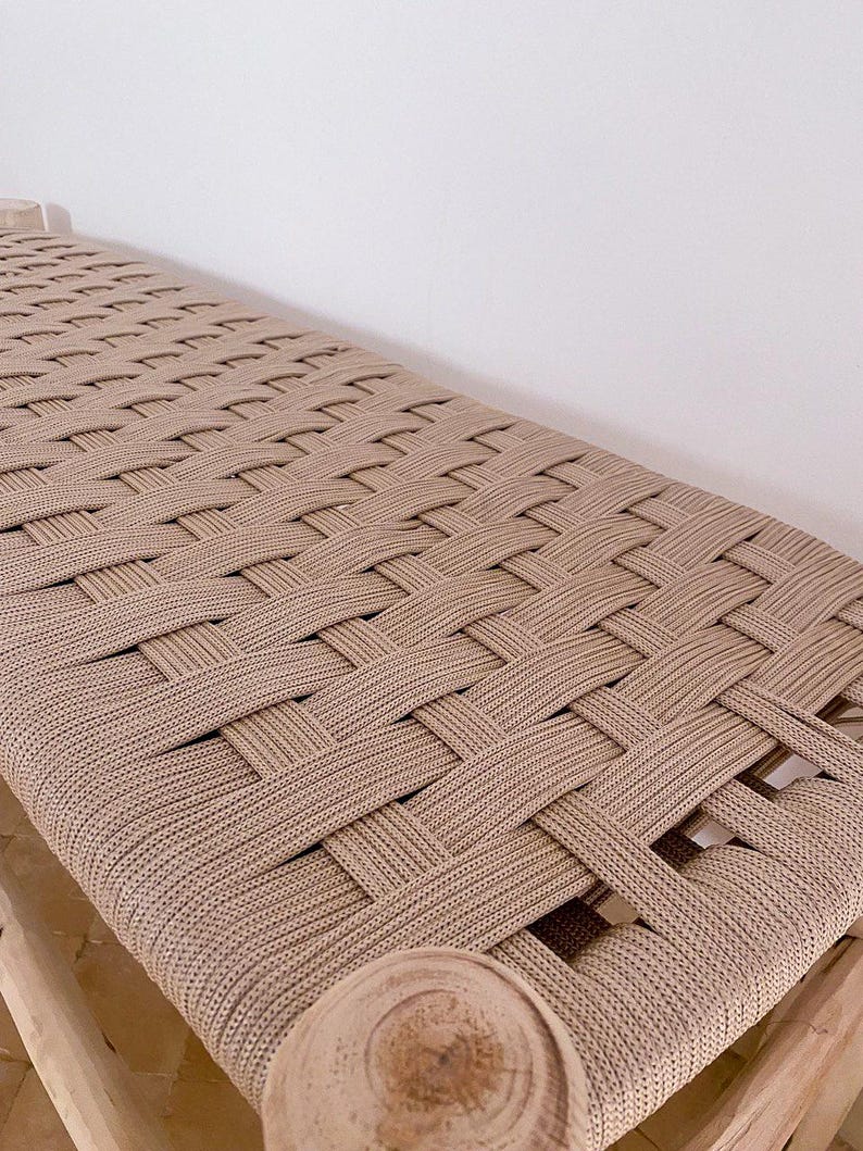 Met de hand vervaardigd uit eucalyptushout en geweven koord is elke bank uniek, met natuurlijke variaties in kleur, textuur en afmeting die het echte Marokkaanse ambachtswerk weerspiegelen. Ideaal voor gebruik binnenshuis, maar ook geschikt voor buitengebruik wanneer hij goed wordt afgedekt.
