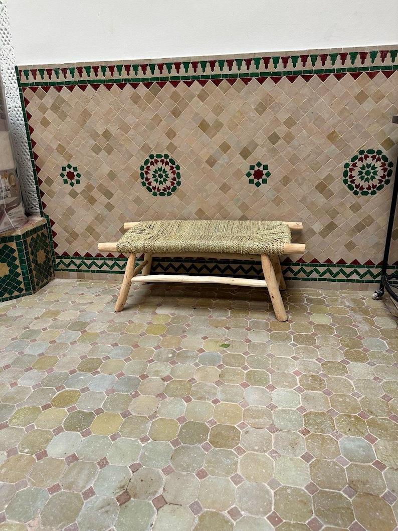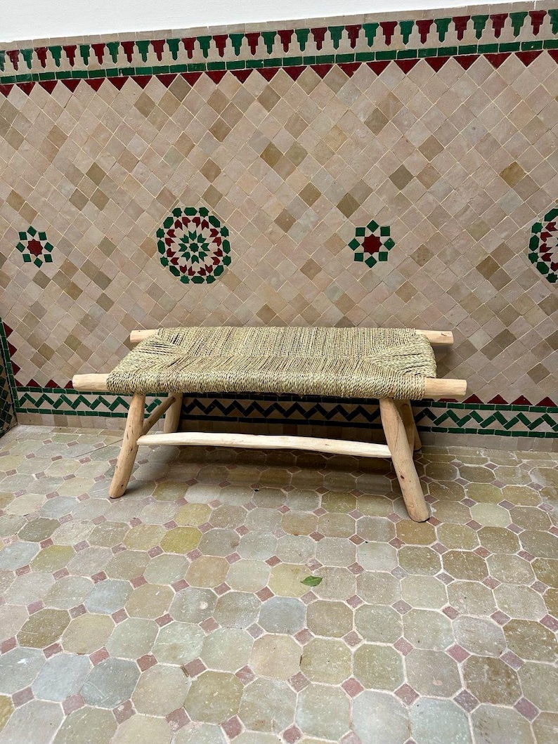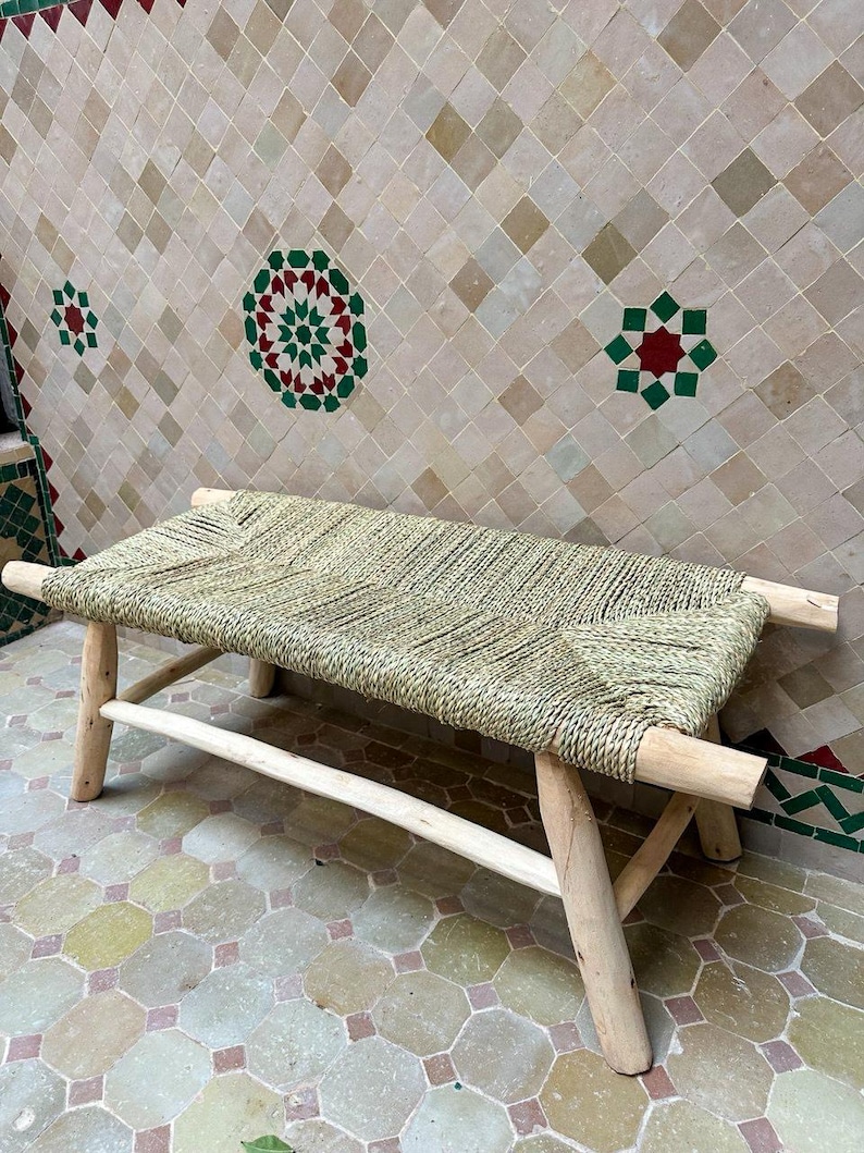 Handwoven Moroccan Bench with Green Rope – Handmade Eucalyptus Wood