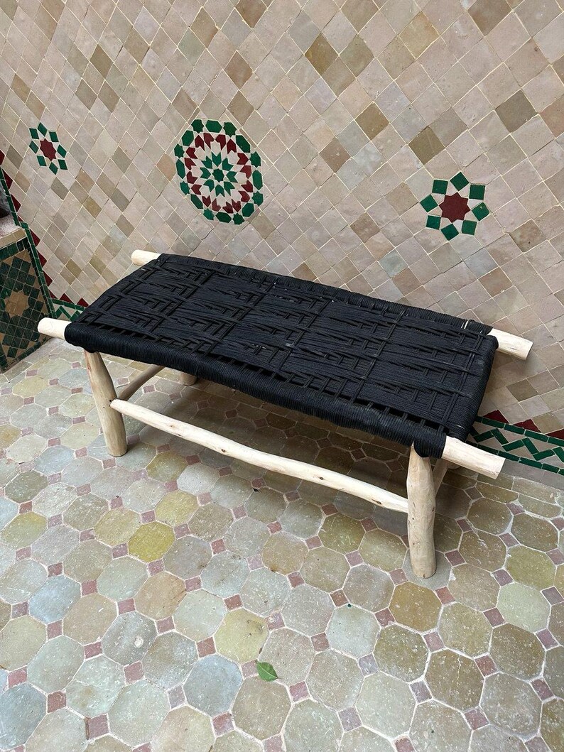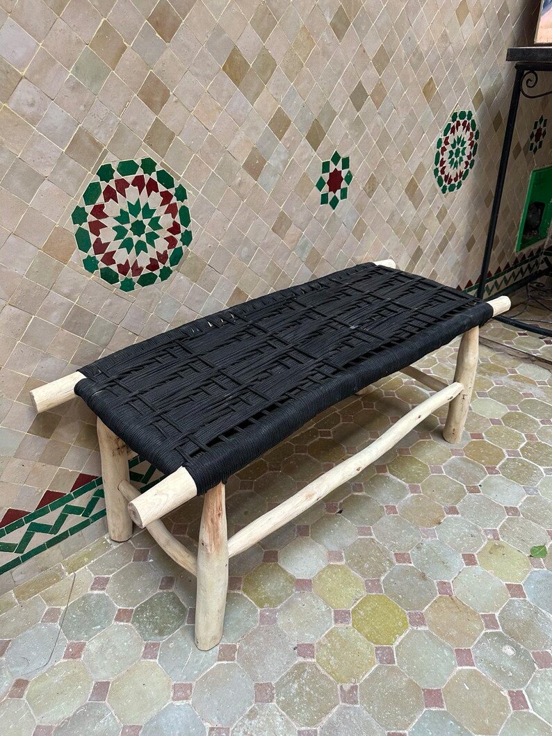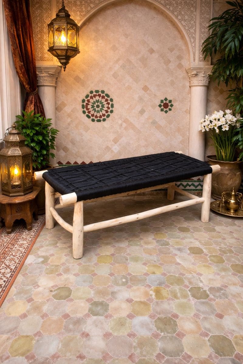 Met de hand gemaakt van eucalyptushout en zorgvuldig geweven zwart koord, is elke bank uniek. Natuurlijke variaties in kleur en textuur weerspiegelen het echte Marokkaanse ambachtswerk. Ideaal voor gebruik binnenshuis en, mits goed afgedekt, ook geschikt voor buitengebruik.