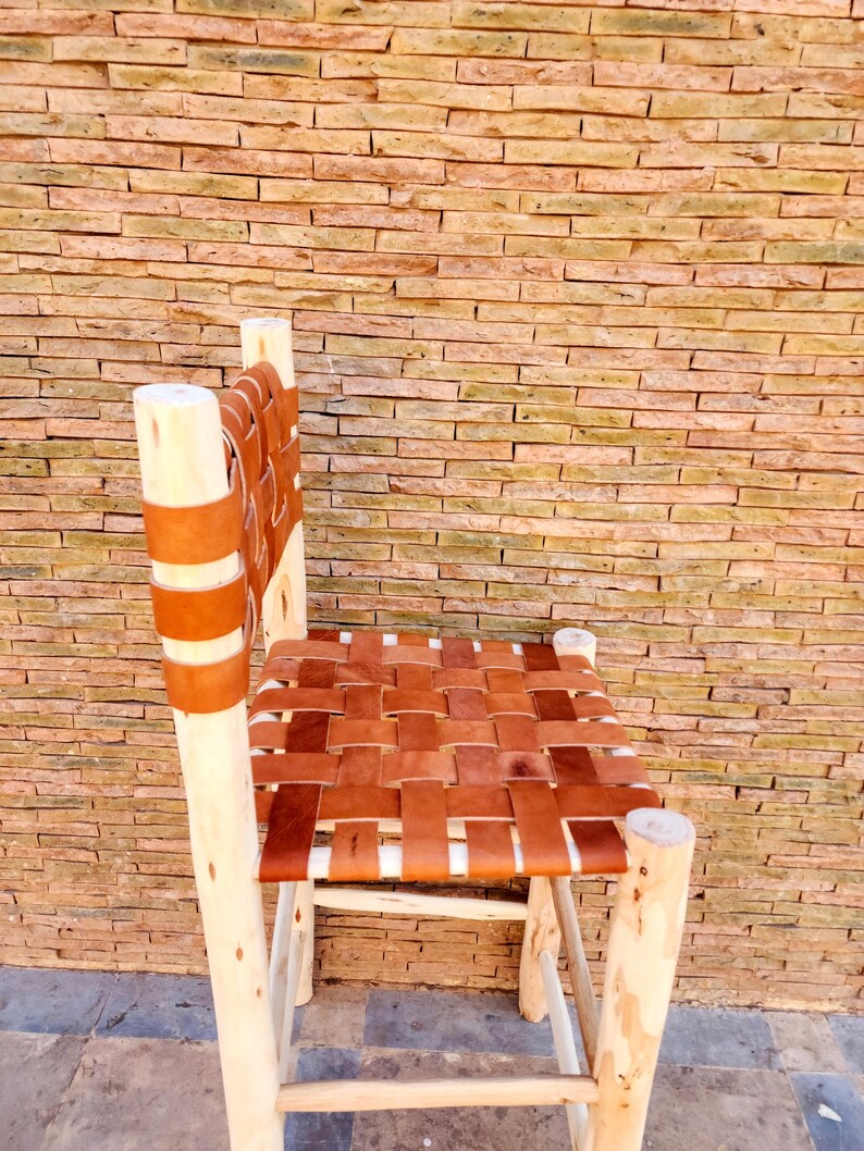 This wooden bar stool with leather seat and backrest adds a refined bohemian touch to any interior. Fully handcrafted, it offers authentic Moroccan artisan quality.