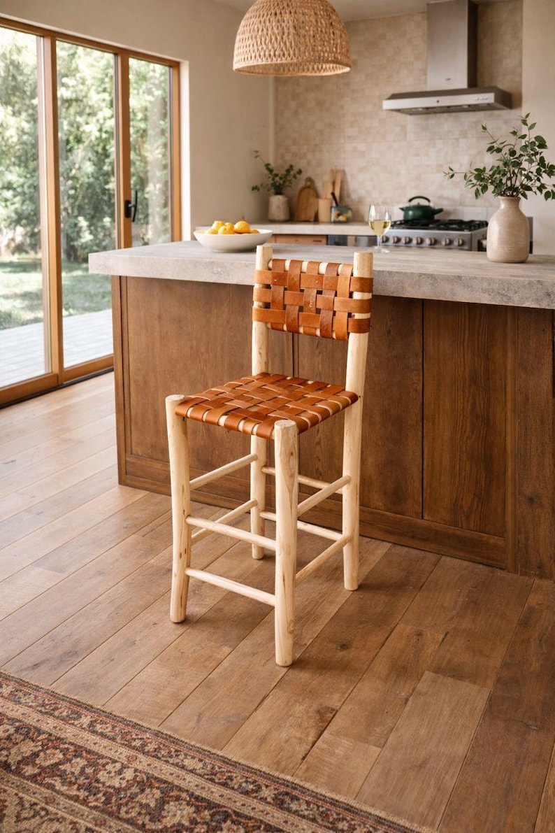 Made from solid wood and leather, this bar stool combines rustic charm with everyday comfort.