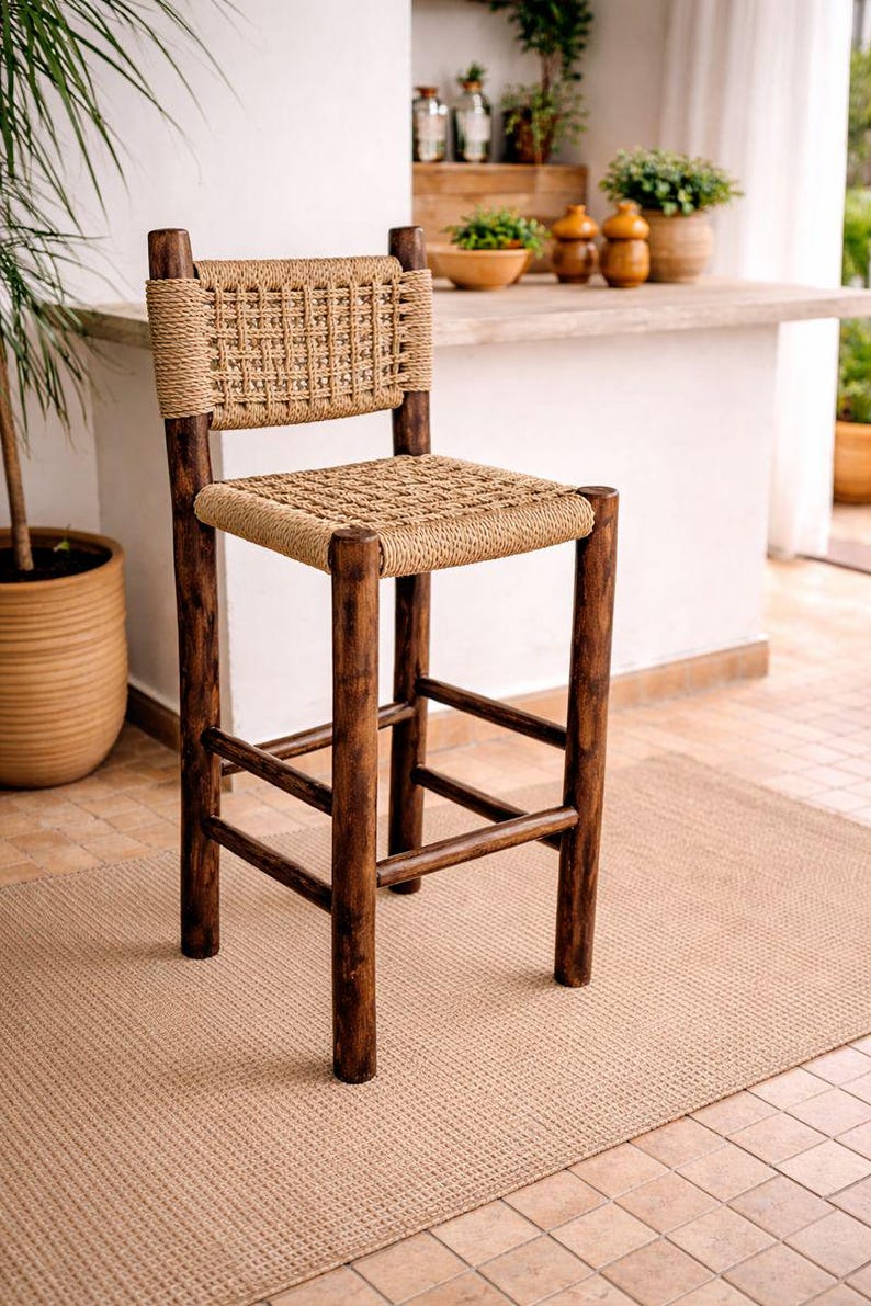 Moroccan Bar Stool with Palm Leaf Rope – Handmade Laurel Wood