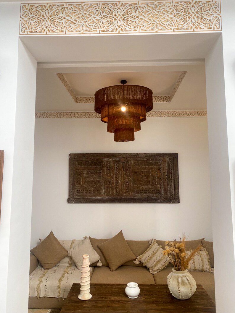 This Moroccan Hdoum fringe pendant lamp is a bold, handcrafted lighting piece made using traditional fringe techniques. The tiered layered design creates movement, depth, and a soft visual rhythm.