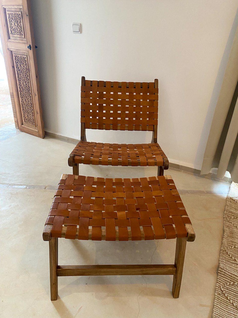 Experience the beauty of traditional Moroccan craftsmanship with this Moroccan Nutwood Armchair & Ottoman Set with Leather. Handcrafted from solid nutwood and woven with high-quality leather, this set blends natural elegance with exceptional comfort.