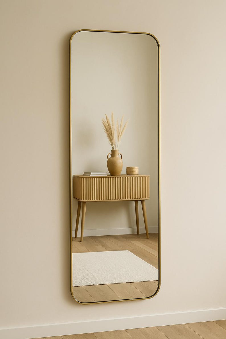 Its clean rectangular shape makes it versatile for entryways, living rooms, bedrooms, or bathrooms. The reflective surface brightens the space while complementing bohemian, coastal, rustic, and minimalist interiors.