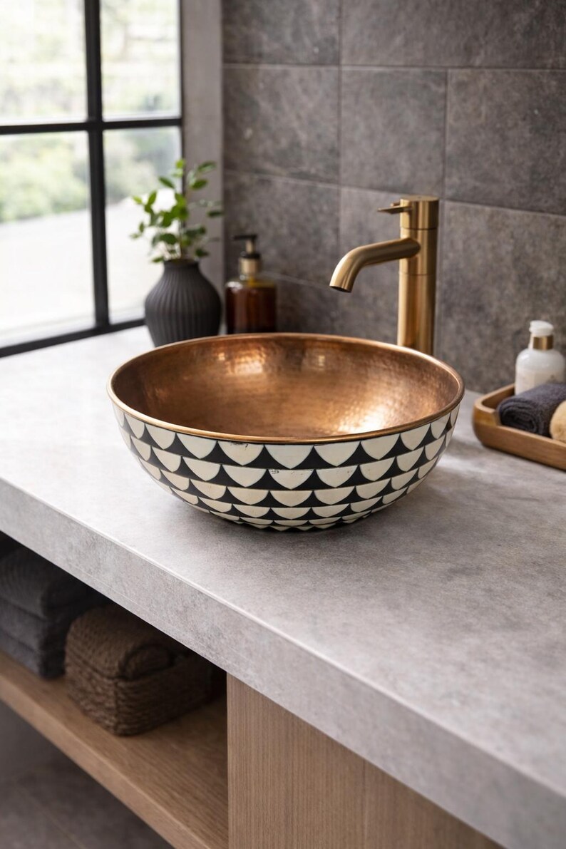 Add a bold designer touch to your bathroom with this patterned ceramic and copper vessel sink bowl. Featuring a warm hammered copper interior and a striking black-and-white geometric exterior, this countertop basin blends modern style with artisan character.