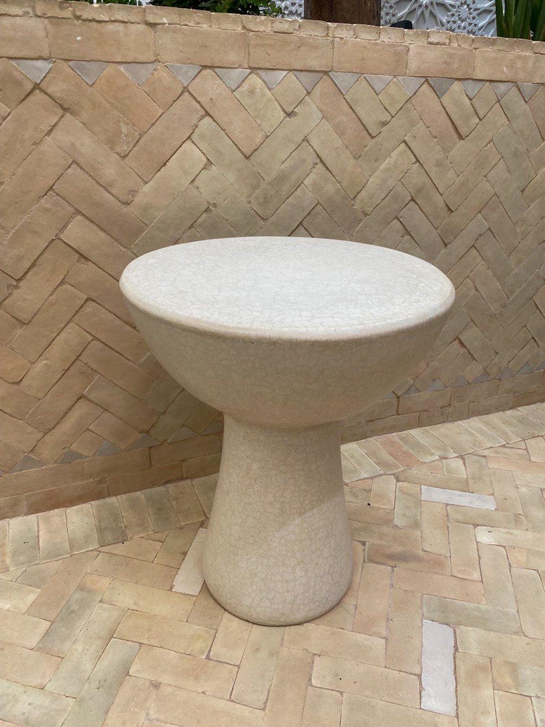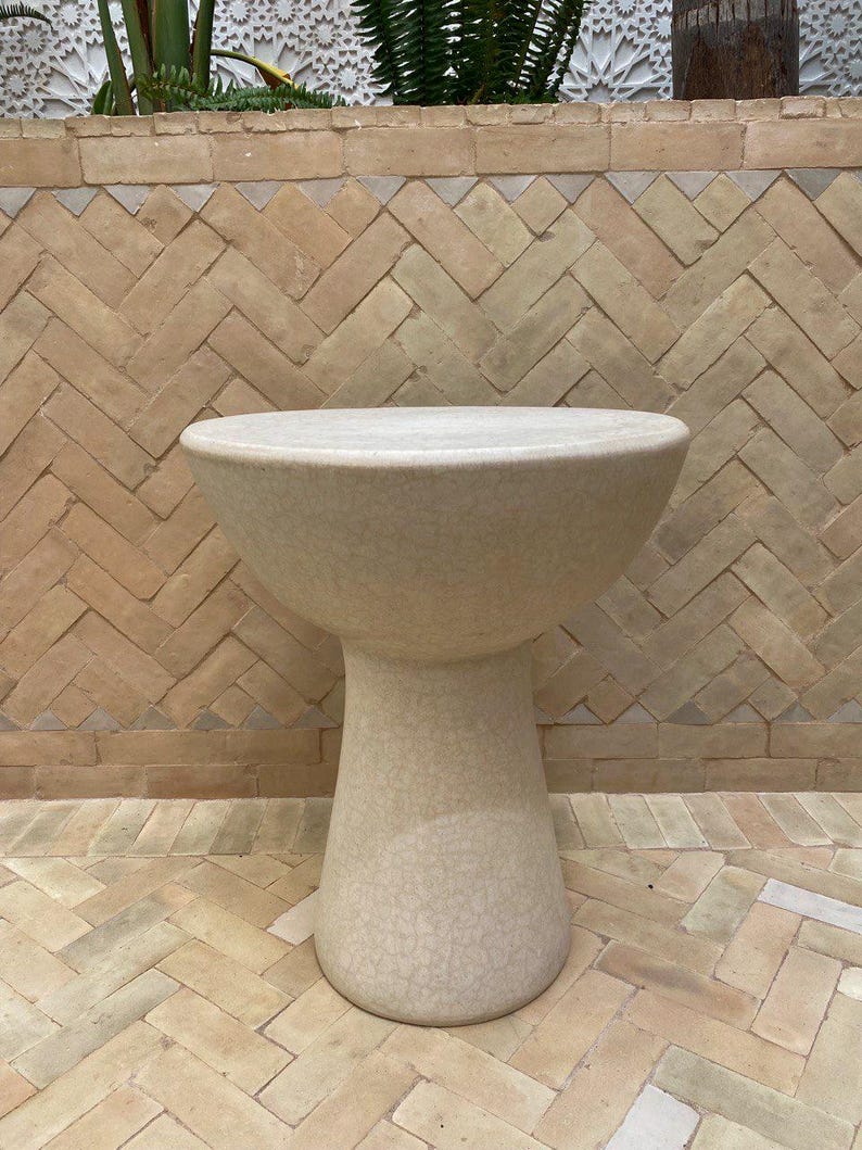 Geef je ruimte extra uitstraling met deze elegante Poetry bijzettafel, een sculpturaal statementstuk geïnspireerd op moderne Marokkaanse esthetiek. Het afgeronde, komvormige blad en de taps toelopende voet creëren een harmonieuze, minimalistische vorm die naadloos past bij zowel binnen- als buitendecoratie.
