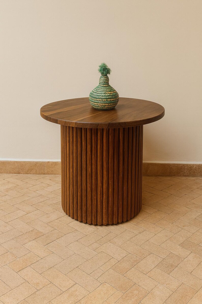 De sculpturale cilindervormige voet met verticale details geeft de tafel een verfijnde en tegelijk organische uitstraling, terwijl het gladde ronde blad een praktisch oppervlak biedt voor decoratie, boeken of dagelijkse benodigdheden. Het minimalistische ontwerp past moeiteloos in moderne, bohemian en rustieke interieurs, of de tafel nu naast een bank staat, in de slaapkamer wordt geplaatst of dient als accenttafel.