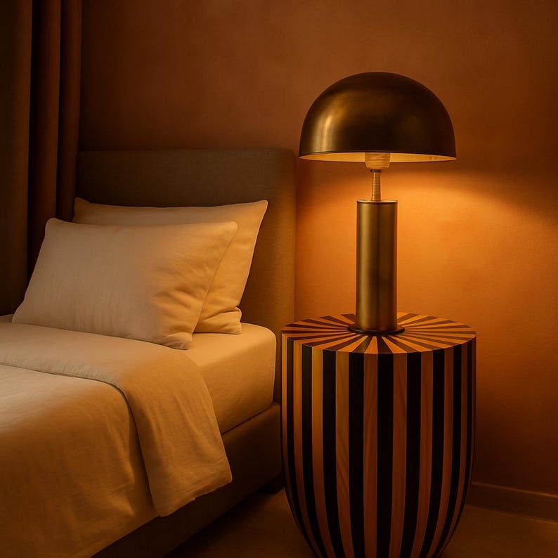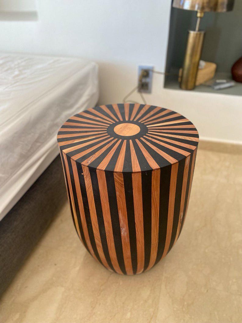 De sculpturale cilindervormige voet met verticale details geeft de tafel een verfijnde en tegelijk organische uitstraling, terwijl het gladde ronde blad een praktisch oppervlak biedt voor decoratie, boeken of dagelijkse benodigdheden. Het minimalistische ontwerp past moeiteloos in moderne, bohemian en rustieke interieurs, of de tafel nu naast een bank staat, in de slaapkamer wordt geplaatst of dient als accenttafel.