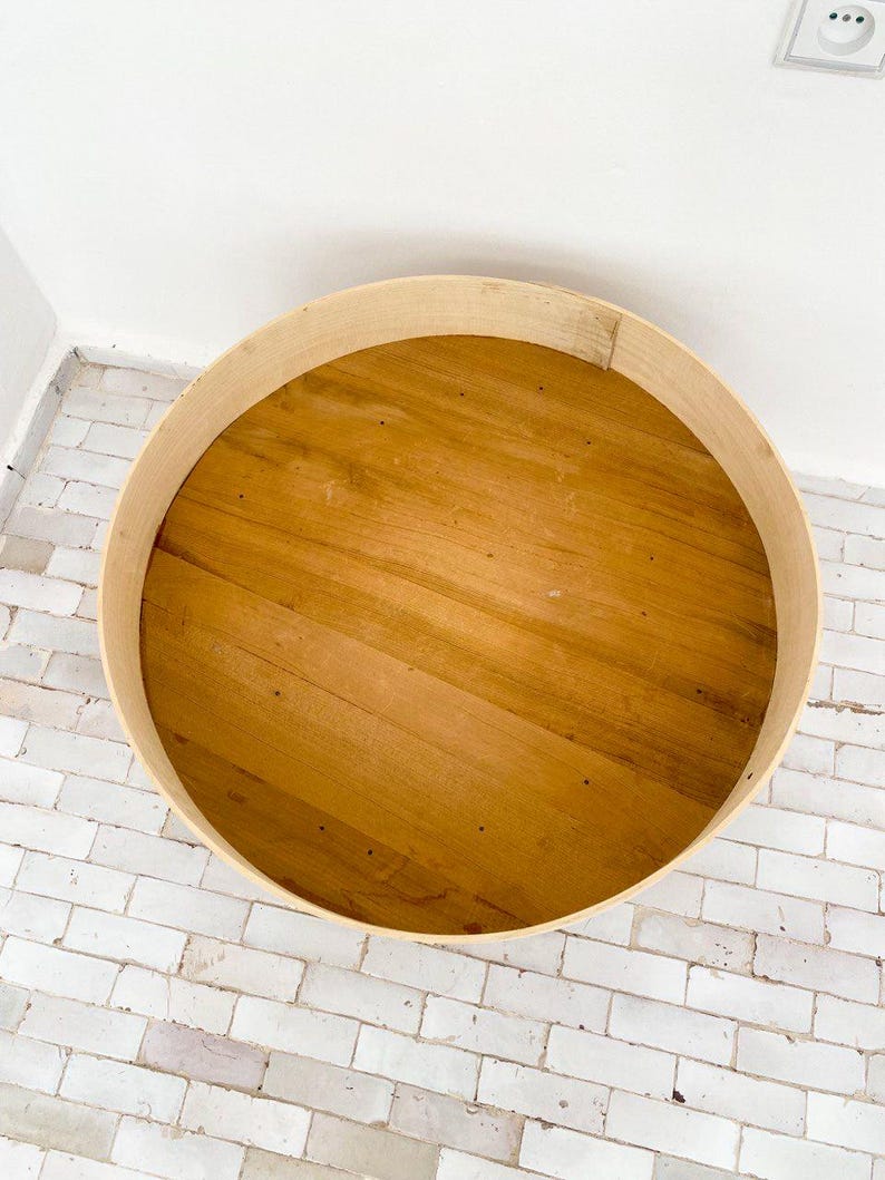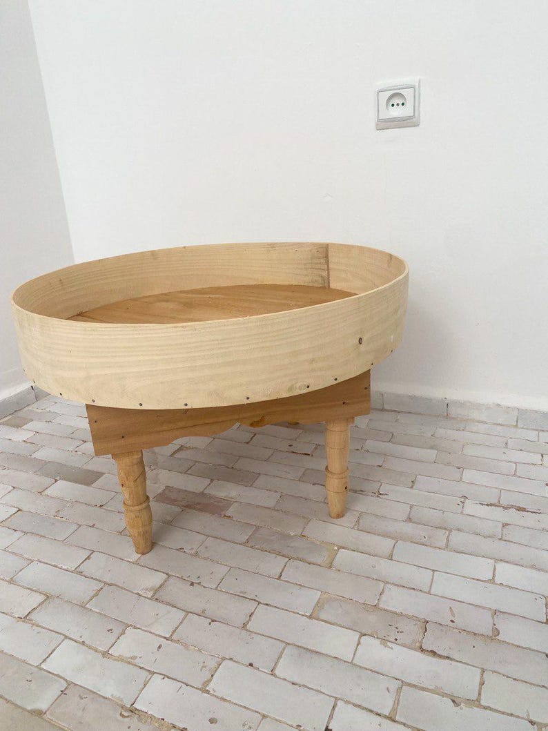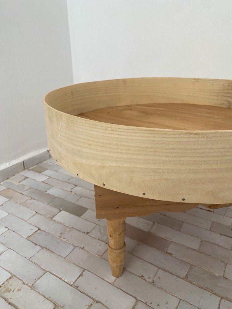 Breng authentieke Marokkaanse charme in huis met deze prachtig handgemaakte ronde houten salontafel. Ontworpen met een opstaande rand en elegante gedraaide poten, combineert deze tafel traditioneel vakmanschap met moderne eenvoud.