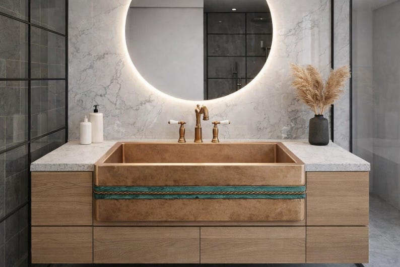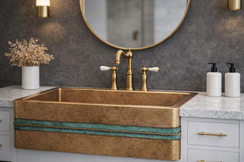 Antique Copper Apron Front Sink – Rustic Farmhouse Bathroom Basin