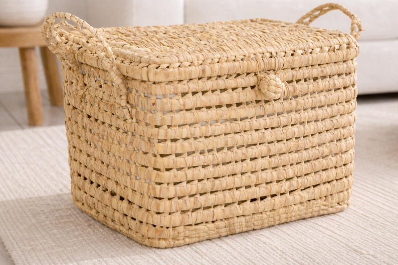 Discover the charm of this small wicker storage chest, handwoven by skilled Moroccan artisans. Compact and practical, it adds natural warmth to any space, from living rooms and hallways to children’s rooms.