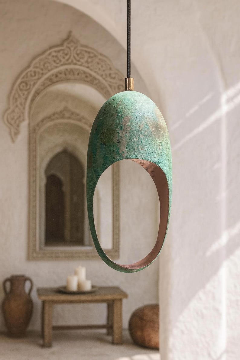 Add a unique sculptural touch to your space with this turquoise patina copper pendant light. Featuring an organic, modern shape with a rich green patina exterior and a warm copper interior, this hanging lamp creates a beautiful contrast and a soft, cozy glow when lit.