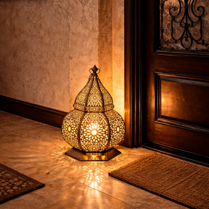 Original price was: € 295,00.€ 205,00Current price is: € 205,00.Moroccan Brass Floor Lantern – Hand-Pierced Base Detail for Entryway & Living Spaces